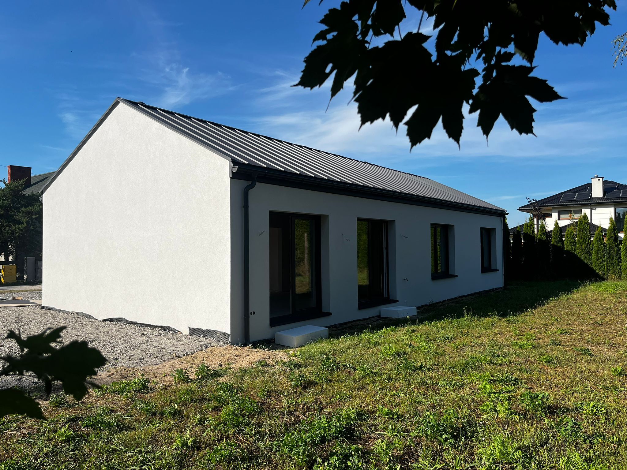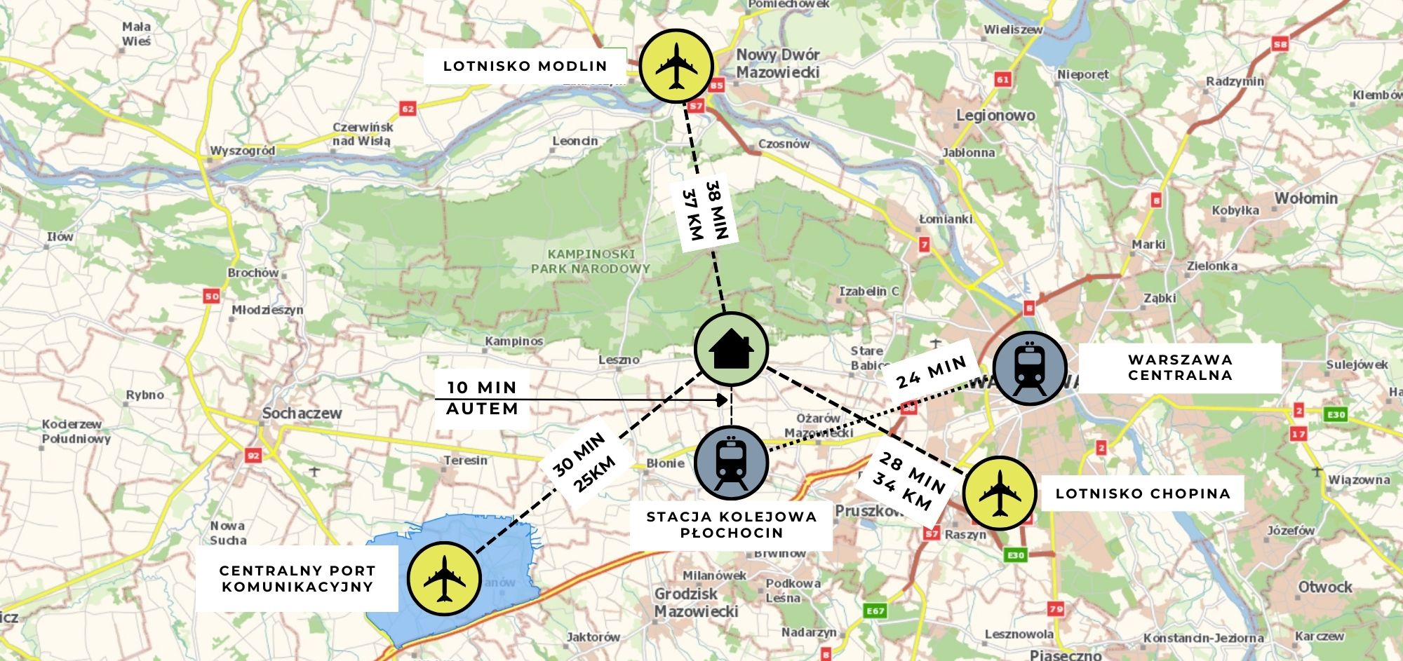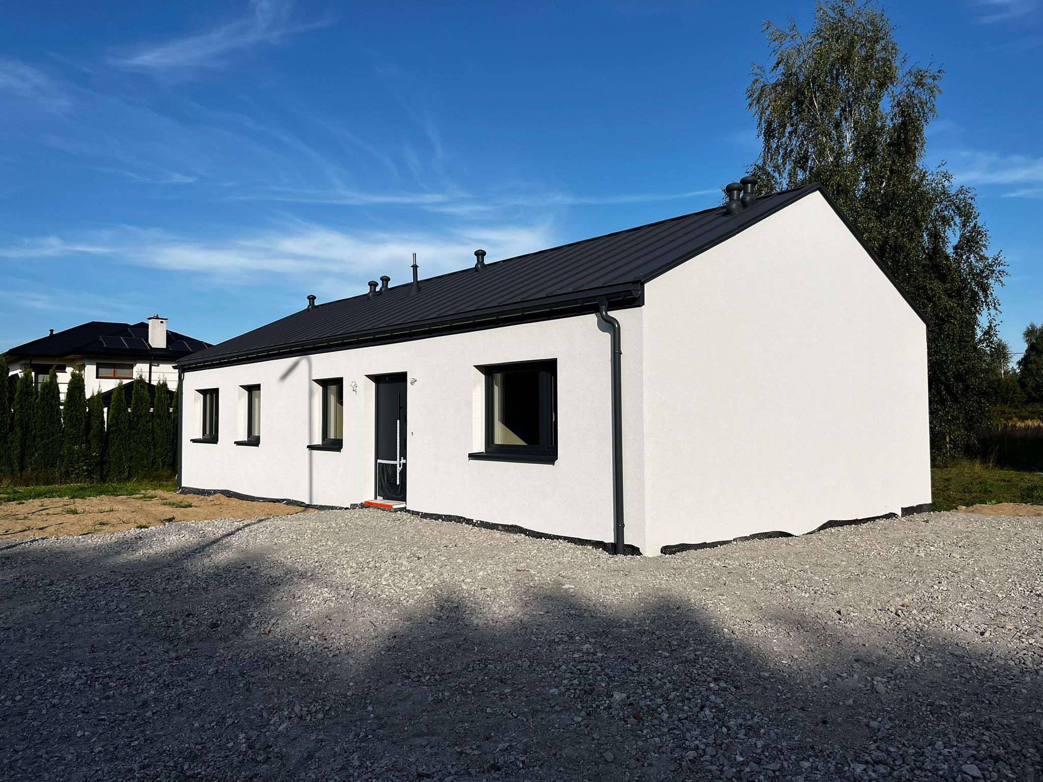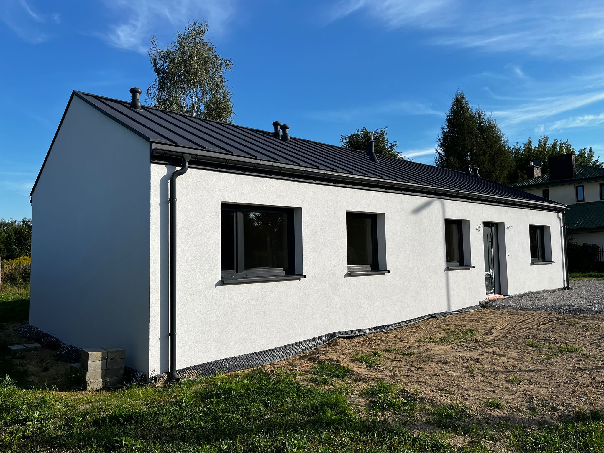 The presented property a detached, single-story, step-free house in a green area near the Kampinos National Park, with a 30-minute drive to each of the three airports Chopin, Modlin and the planned Central Communication Port (CPK).