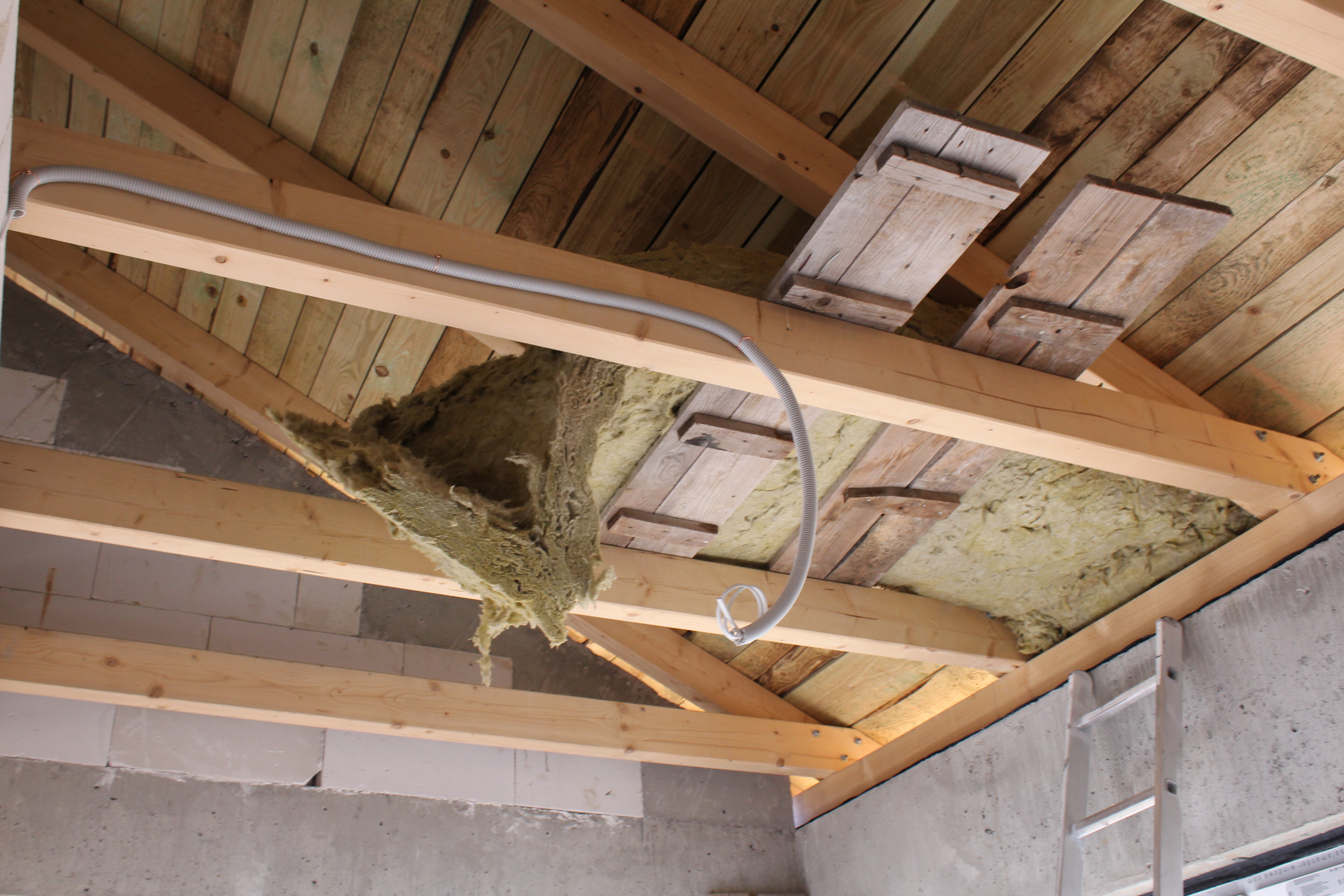While the electrical works were underway, the Builder started with the waterproofing of the slab and installing the mineral wool to the rafters.