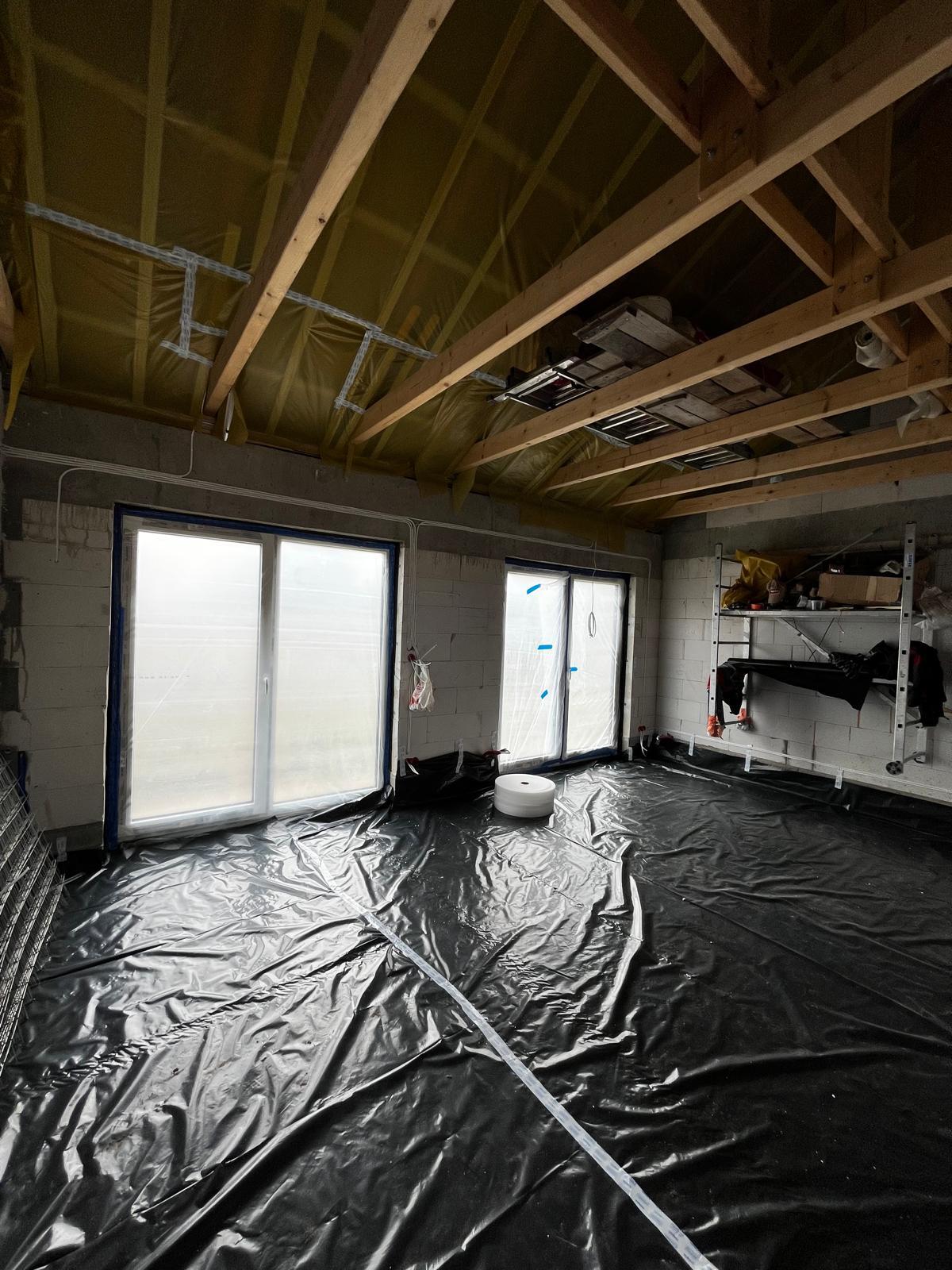 The builder prepared the floor slab for concreting by installing waterproofing on top of the Styrofoam. Expansion foam was installed around the perimeter of the walls to facilitate the concrete work. Mesh reinforcement was also installed to ensure the strength of the area.