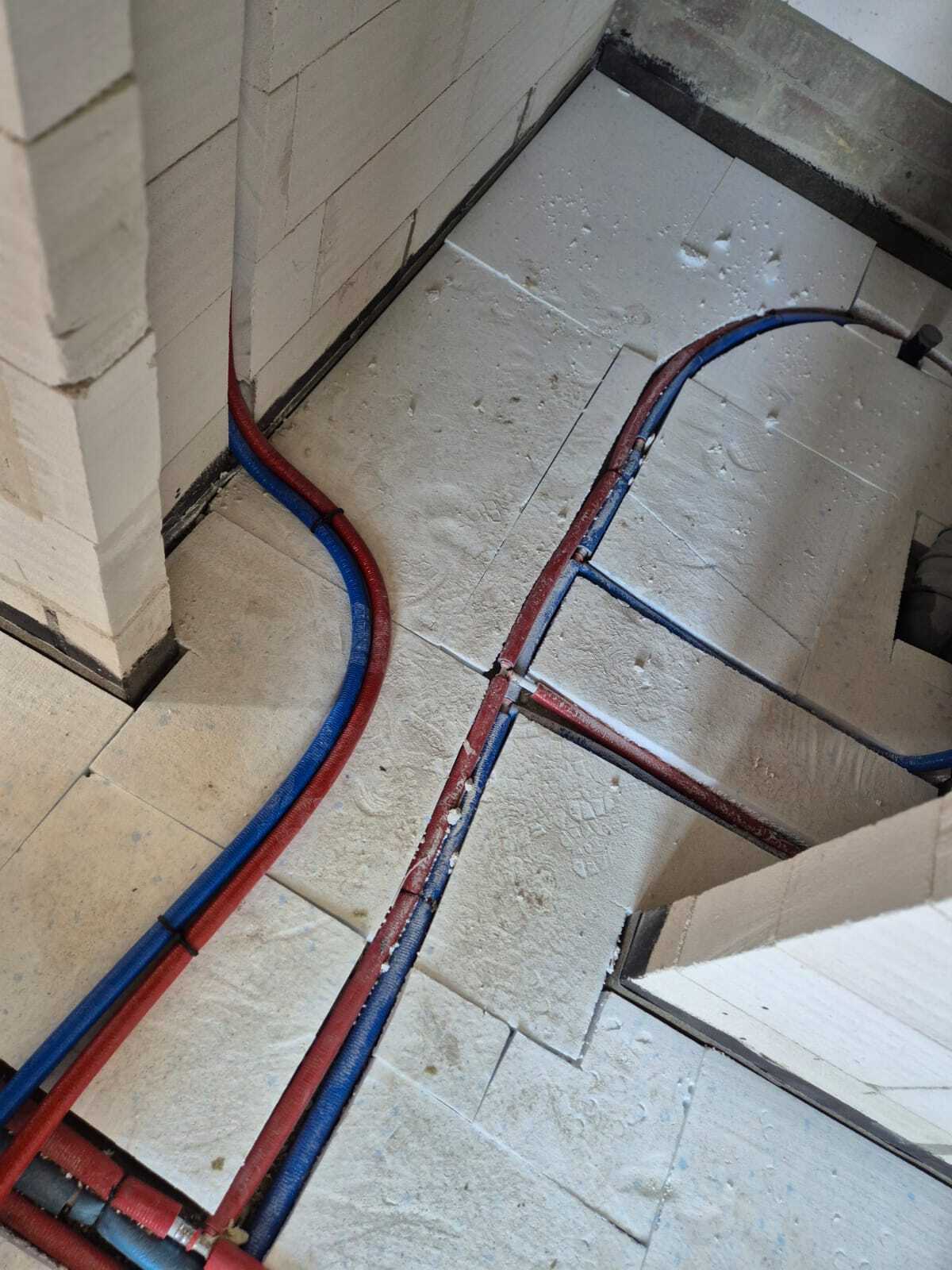 Instalacja systemu grzewczego położona została na wierzchu uprzednio ułożonej warstwy styropianu i instalacji wodnej.
